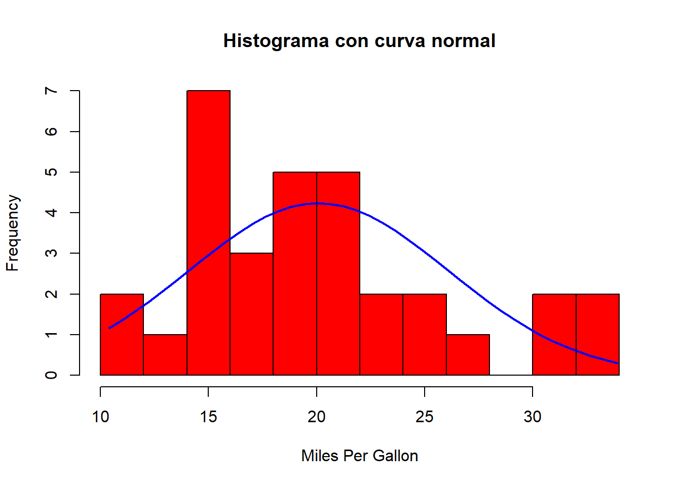 h<-hist(x, breaks=10, col="red", xlab="Miles Per Gallon",