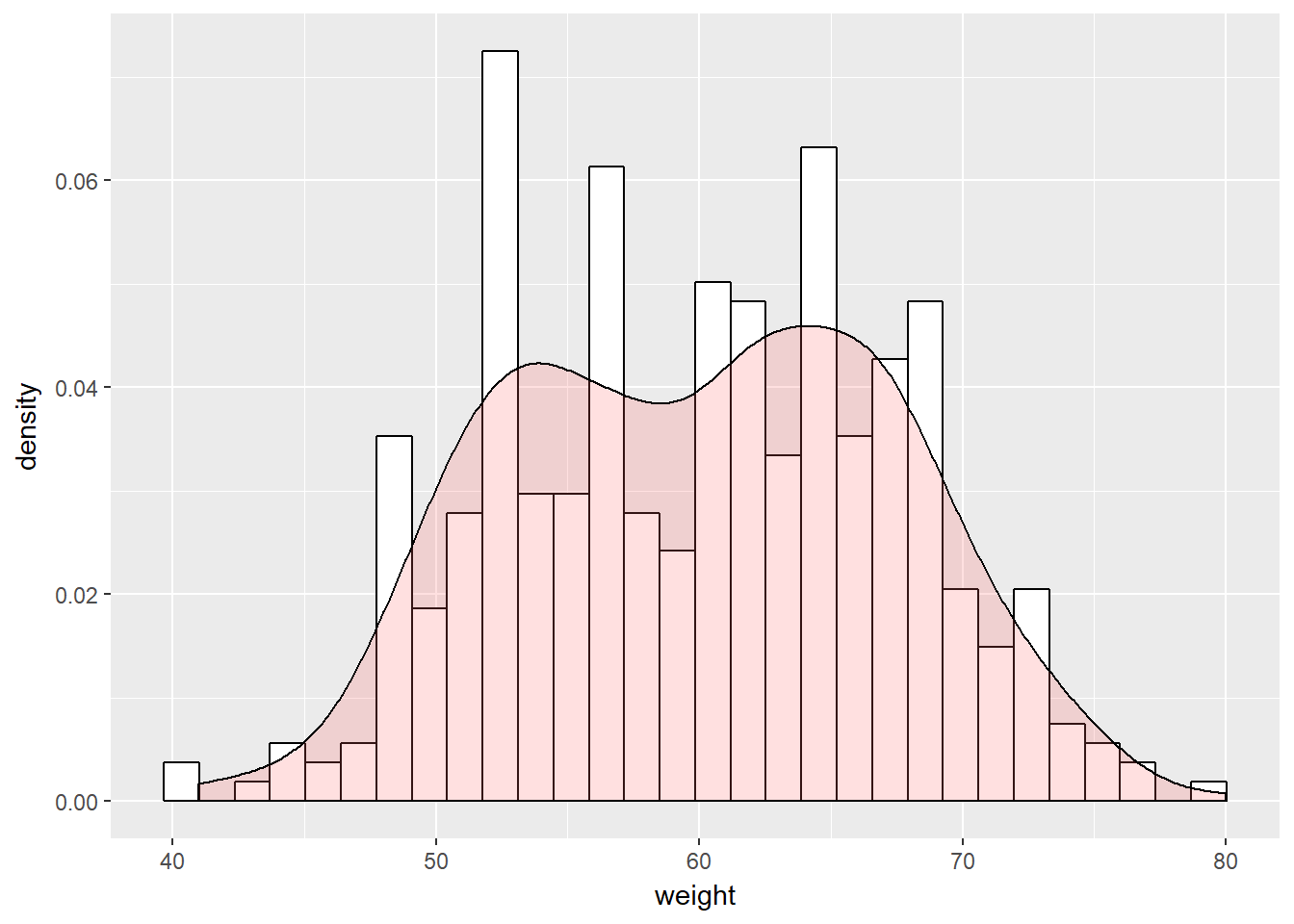 weight=round(c(rnorm(200, mean=55, sd=5), rnorm(200, mean=65, sd=5)))