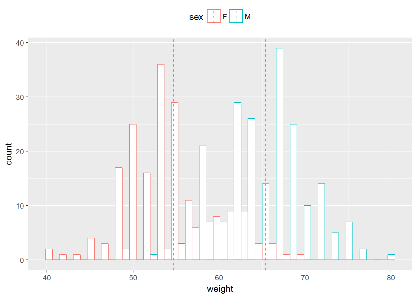 mu <- ddply(df, "sex", summarise, grp.mean=mean(weight))
