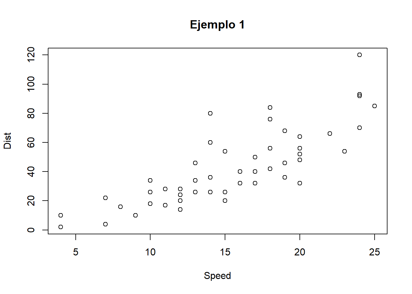 plot(cars$speed, cars$dist, main="Ejemplo 1", xlab="Speed", ylab="Dist")