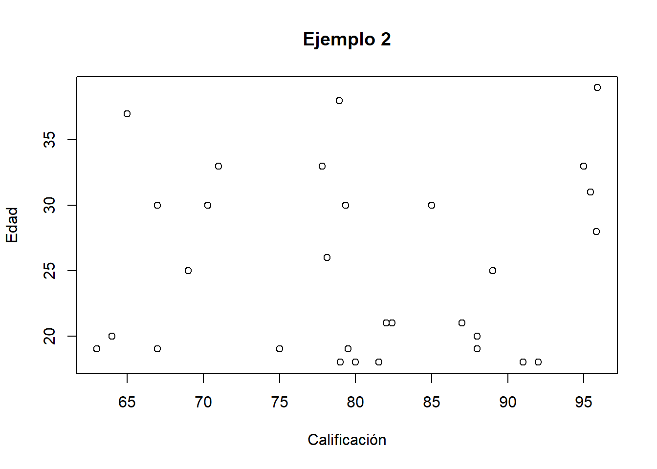 plot(students$`Average score (grade)`, students$Age, main = "Ejemplo 2",