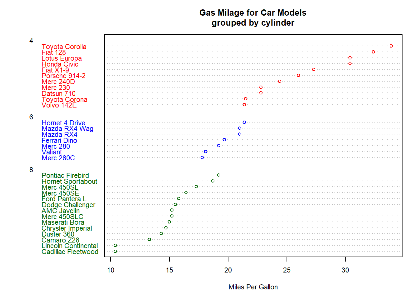 dotchart(x$mpg,labels=row.names(x),cex=.7,groups= x$cyl,
